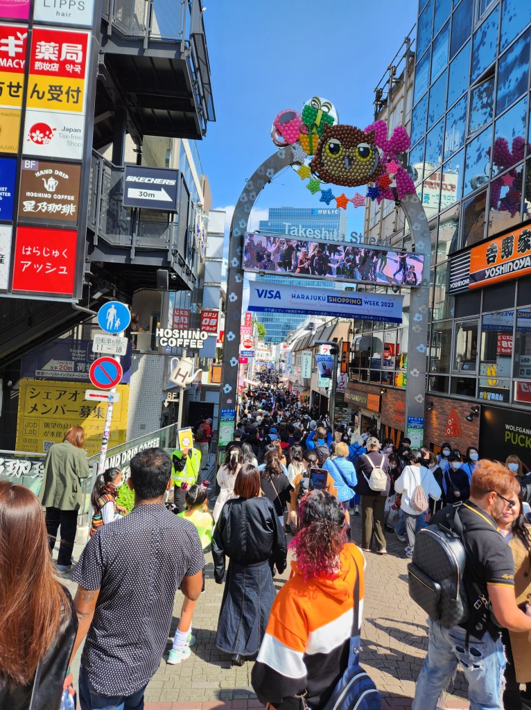 After eating, we decided to take a slight detour on our way over to Shinjuku through the iconic fashion alley, Harajuku. Passing by the stadium for the 2020 Olympics, we found ourselves in the very lively and crowded street of Harajuku. Fashion stores lining the street, broken up by confectionary stores, every single one of which having a long lines out the door. The crowd far too dense to easily navigate through, we queued up to get through the street, passing by people dressed in almost every fashion style I can think of.