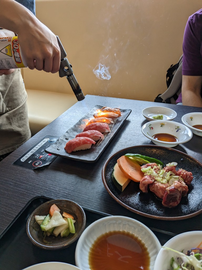 A couple more stops west from Yamadera, and we enter the city of Yanagata. We wandered down a couple of streets in search of somewhere to get some lunch. However, we found our way to a strip of bars, all still closed until later that evening. After a quick Google search and a bit more wandering, we found a place that specialized in beef. After ordering some drinks and enjoying beef sushi that was cooked with a culinary torch in front of us, we went back to the station for the pretty, albeit, hour and a half long train ride back to Sendai.