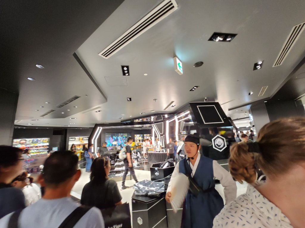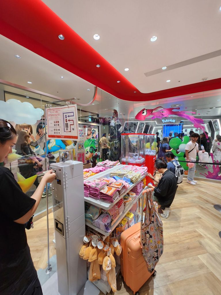 We went to the Nintendo store next, which as you can imagine, is wall to wall goods from all of the major Nintendo franchises (aside from Pokémon, as it has its own stores). Mario, Legend of Zelda, Animal Crossing, Splatoon, and Pikmin merchandise with tons of people trying to find their favourite, it’s a lot of fun, albeit a little chaotic. After wandering around for a bit, I grabbed a souvenir to bring home and then left to go next door to the Shibuya Pokemon Store (yes, this is our third Pokémon store now). The entire store had a black and white colour scheme with flowing signs and designs on the wall, making it feel like an actual location in some of the games.