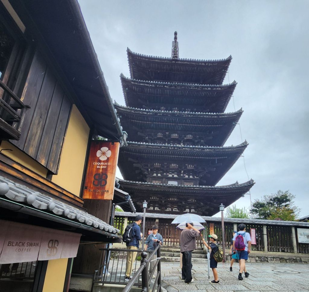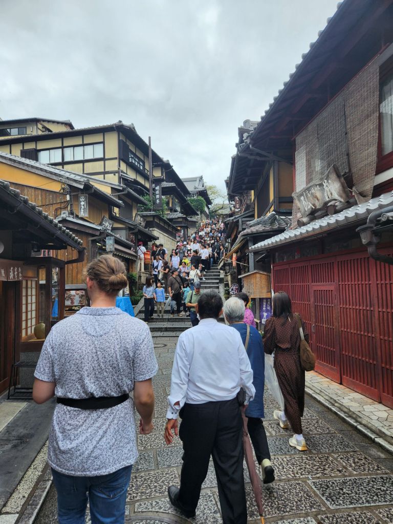 Despite having to weave between the sea of people some of the intersections had, we were still able to see many of the gorgeous buildings and streets of the area. I grabbed a skewer of candied strawberries from one of the stalls and took a photo of the 5 tier pagoda that acts as th centre point, being visible from a lot of the streets there. After checking the famous sights of Kyoto off of the to-do list, we briefly head back to the Inn to get out of the still-present heat, amplified by the plethora of stairs, hills, and crowds in Higashiyama.