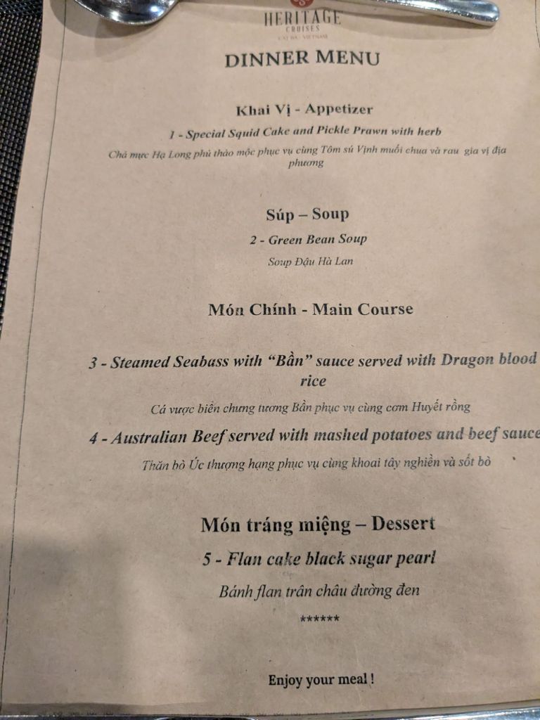 After waiting around for a little bit for the bamboo boats to finish their rounds of the cave, we took the small boat back to the main ship. We were given a refreshing sweet tea when we got back, and had the next scheduled activity at 6:00. I would like to say I spent my time roaming the different activity rooms in the boat until Happy Hour at 6, but I didn’t even do that much, I just lied down until dinner. This did give me time to catchup on my notes, but since we’re on a boat away from mainland, we don’t have wi-fi or signal on the boat, so I can’t upload the previous day’s post.